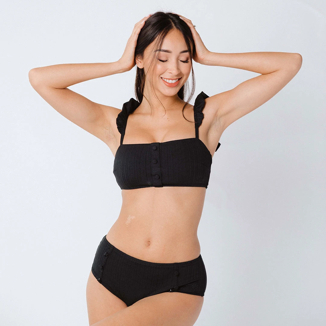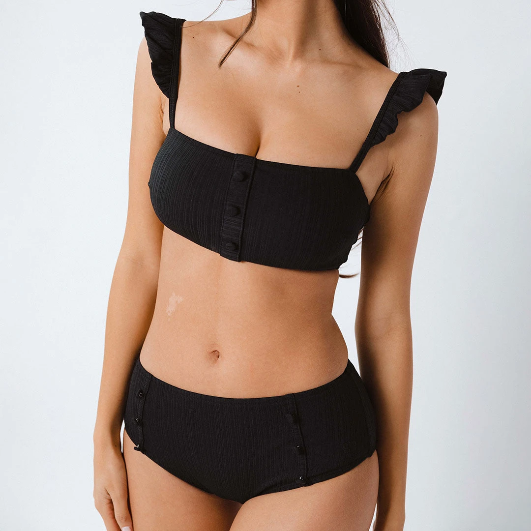 Need a cute pair of neutral bottoms for your upcoming beach trip? These midi pin-up bottoms will fit perfectly in your suitcase. We love the grooved texture and adorable sailor button detail, especially paired with the matching ruffle sleeve top. Designed with our sustainable fabric made of recycled material, these Albion Fit swim bottoms have a vintage flair while still being modern.