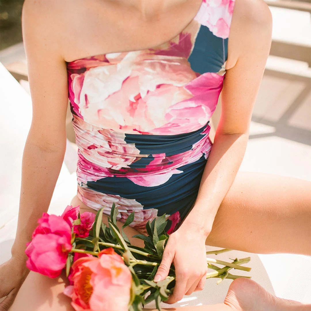 One of our best-selling silhouettes! The Icon is just that—a stand-out one-shoulder swimsuit with flattering ruching and the most eye-popping pink floral print. This suit is an amazing combination of sporty, flirty, and comfortable. It will be your new go-to style!