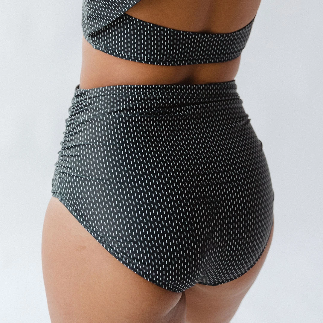 Swim, play, snorkel, spike a volleyball… Do all the things with confidence in our ruched high waisted bottoms in our best-selling midnight dash print! The side ruched detail camouflages and flatters every body, and the slightly higher rise provides a little extra coverage.