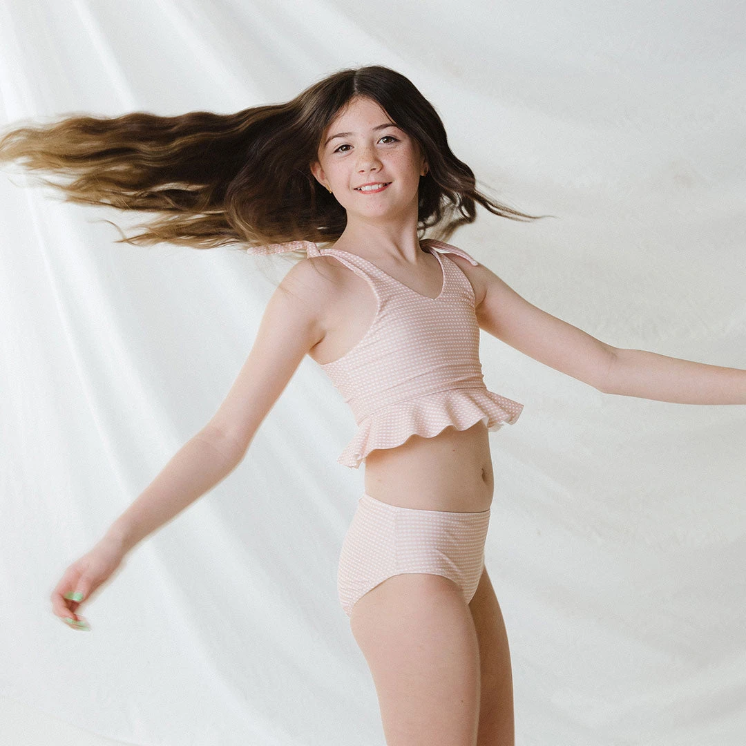 Because coordinating with our littles is pretty darn cute! A sweet pink checkered tankini set with ties at the shoulders is kid-friendly but stylish in every way. SPF protected fabric give your little one extra sun protection (still later those babies up though).