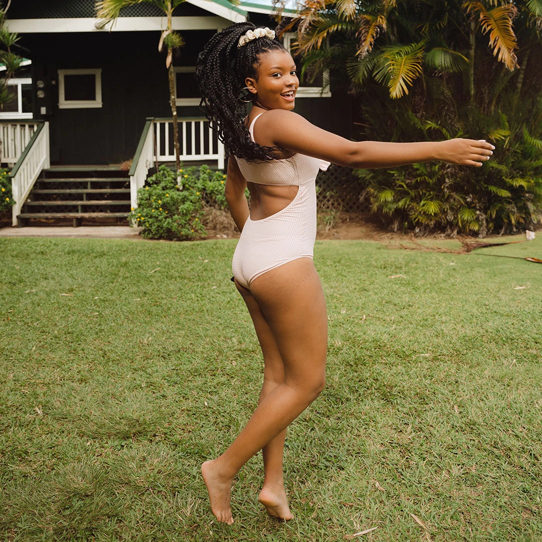 One of our most feminine styles, the Top Knot One-Piece, is back in pink gingham! This open back one-piece swimsuit features a bow and keyhole design on the front. plus a flirty cutout in the back. It’s feminine, it’s pink, and it’s perfect for your next getaway.